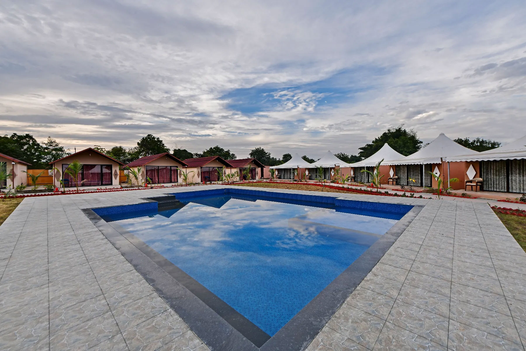 Recreation: Amenities include a swimming pool, gardens, and curated activities like light treks, cycling, and campfires.